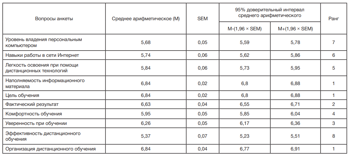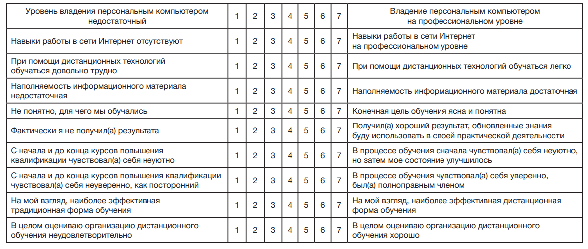 Таблица 1. Методика оценки эффективности дистанционного обучения