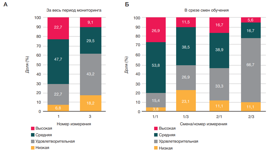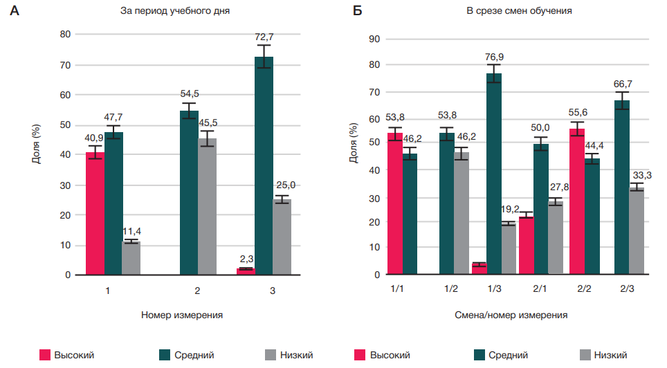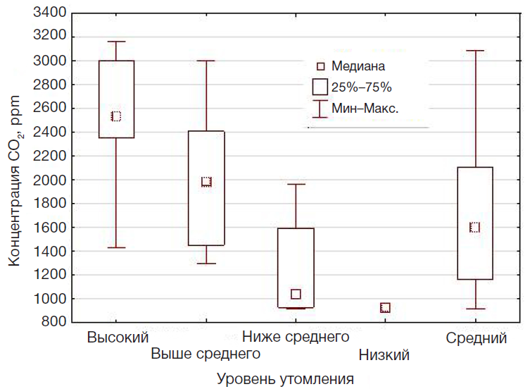 Рис. 6. Распределение групп учащихся по результатам оценки уровня утомления в зависимости от фактических концентраций углекислого газа за весь период мониторинга