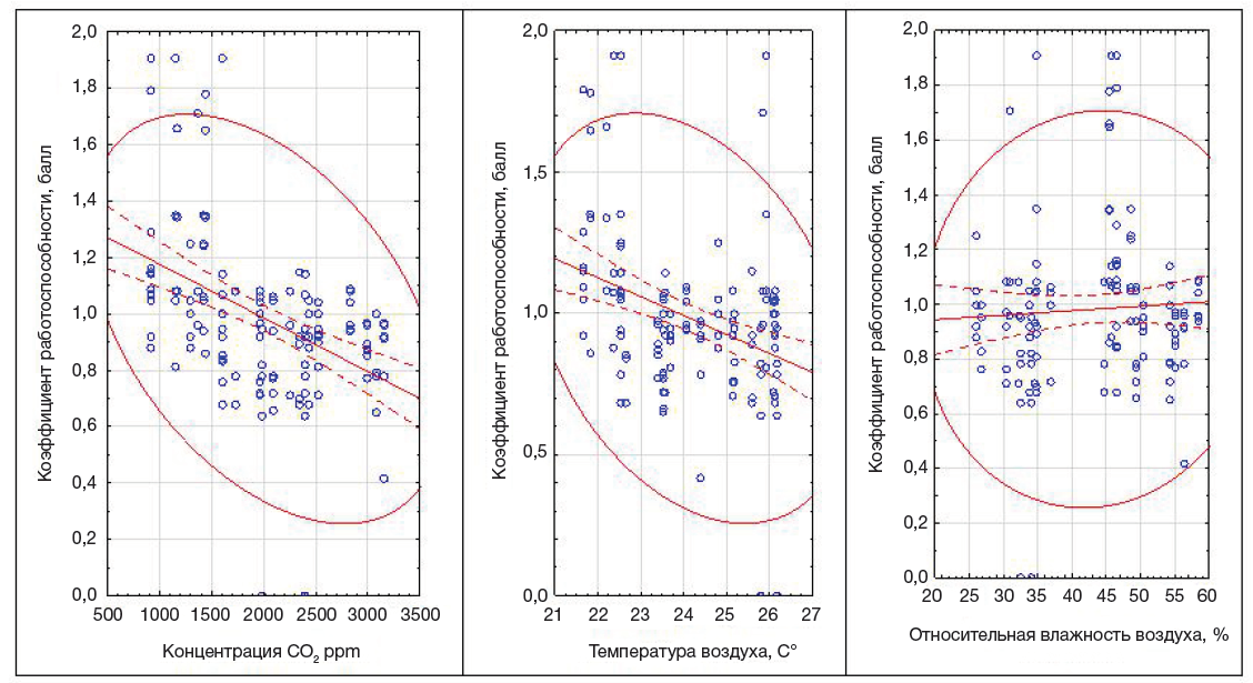 Рис. 2. Диаграмма рассеивания для корреляций между показателями концентрации СО2, температуры, относительной влажности воздуха и коэффициентом работоспособности