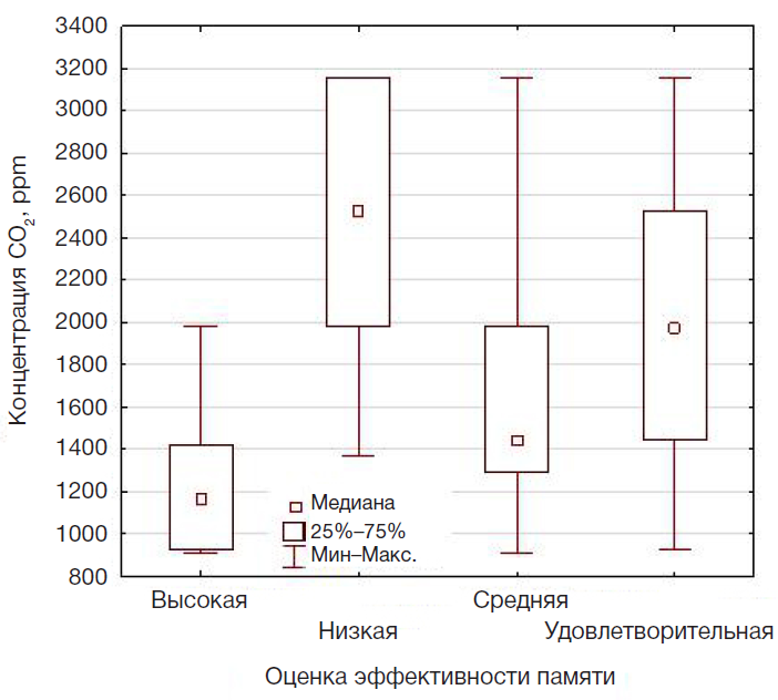 Рис. 4. Распределение учащихся по результатам оценки кратковременной памяти в зависимости от фактических концентраций углекислого газа за весь период мониторинга
