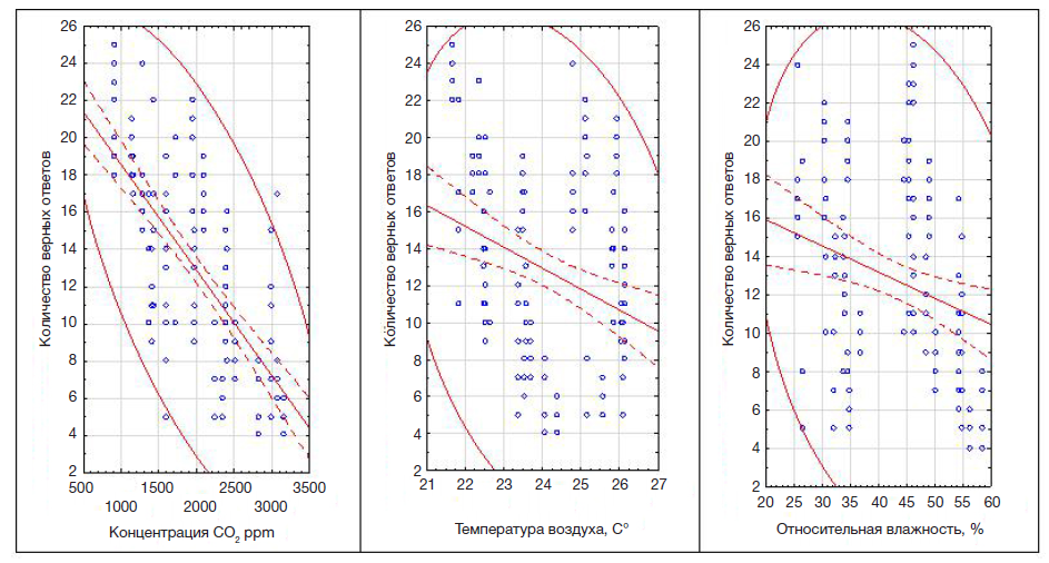 Рис. 5. Диаграмма рассеивания для корреляций между показателями микроклимата, концентрации СО2 и количеством верных ответов по результатам тестирования